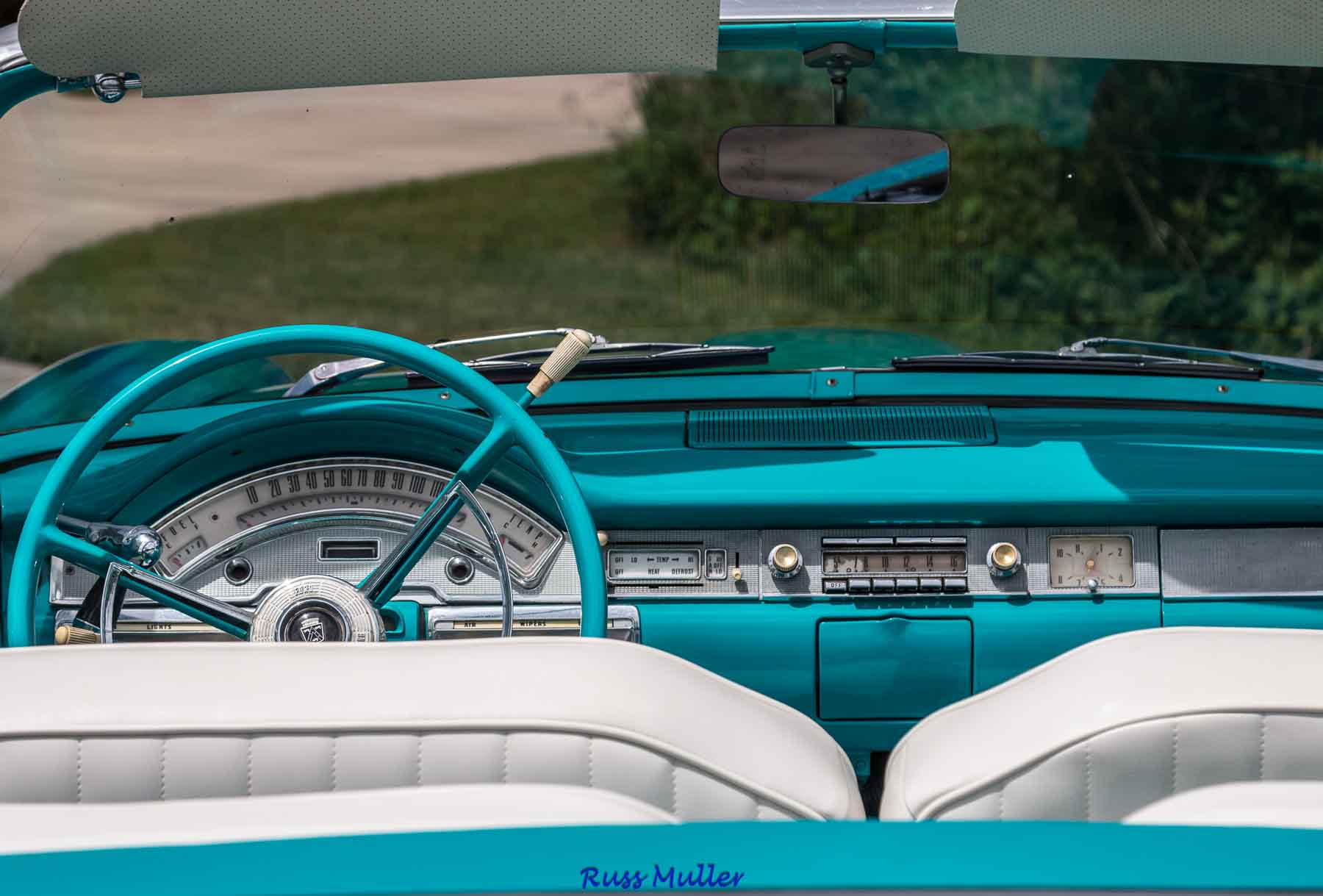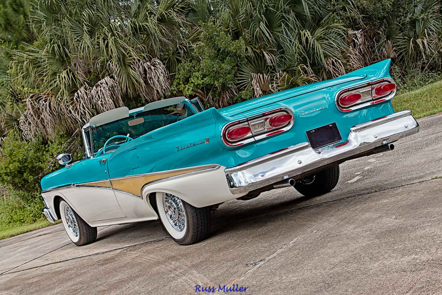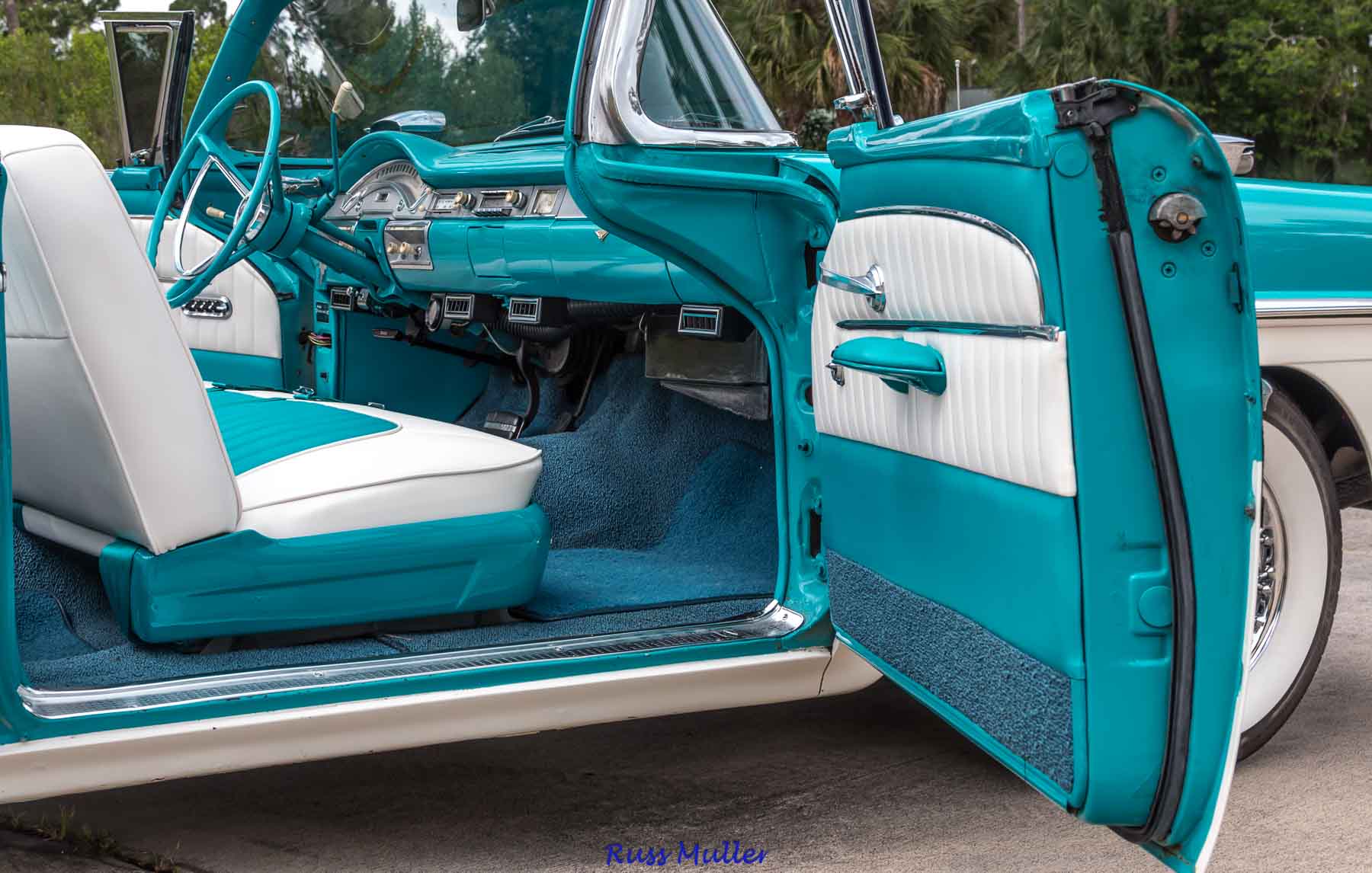 This beautiful example is one of 14,713 produced for 1958. The two tone colors are Azure Blue and Colonial White. It features a 300 horsepower 352 cubic inch V-8 and Cruise-O-Matic automatic transmission. Other features include power steering, power