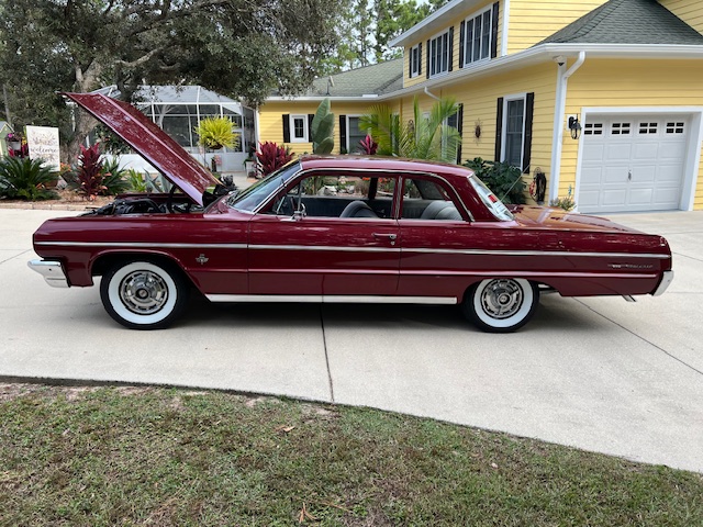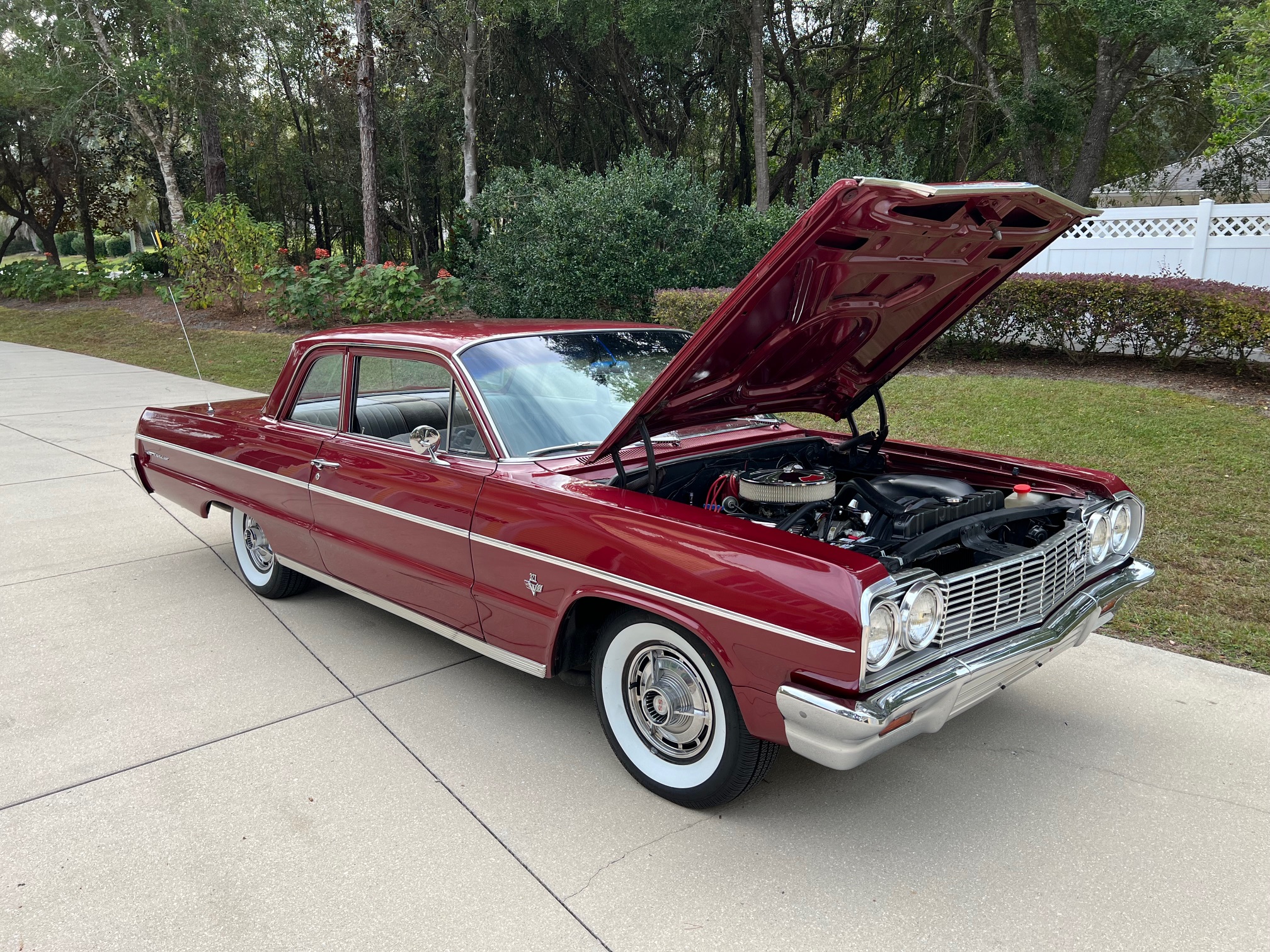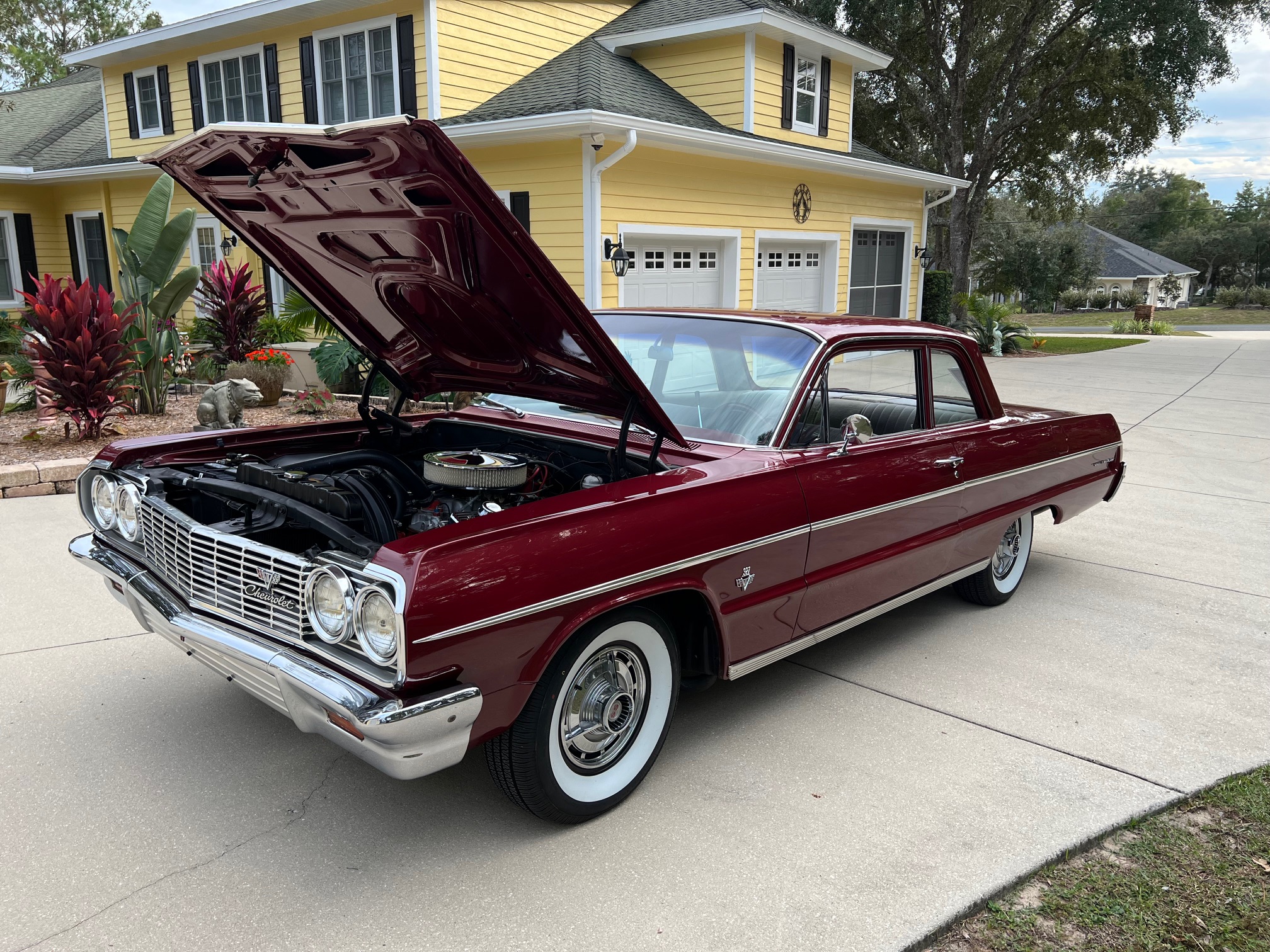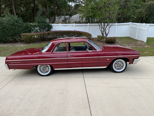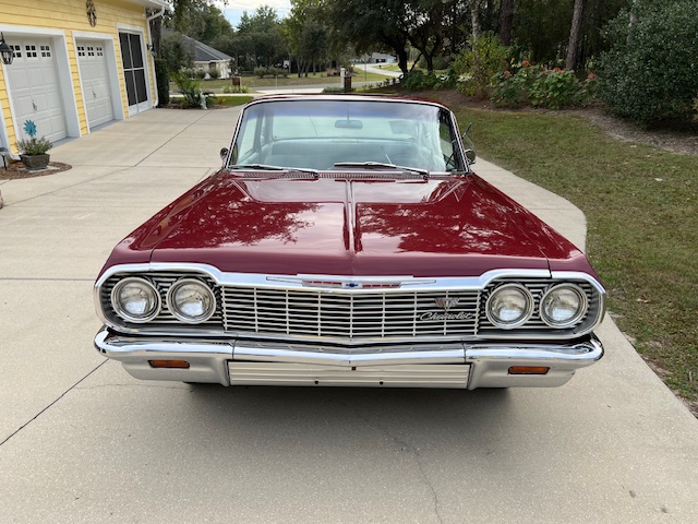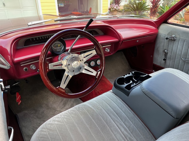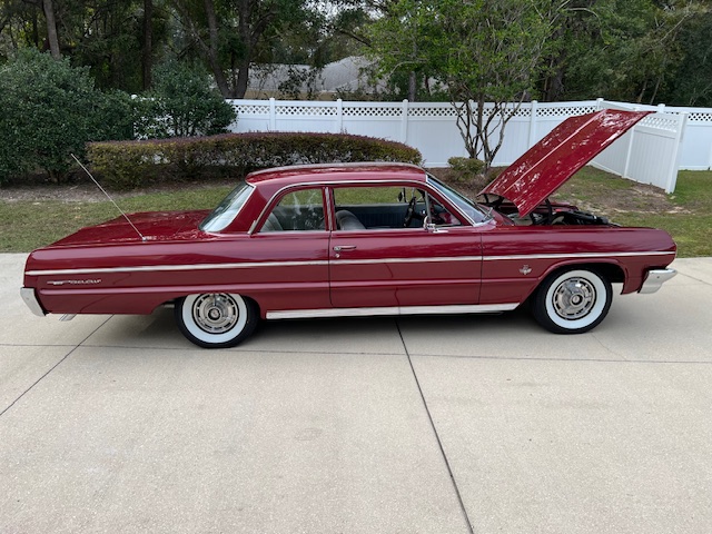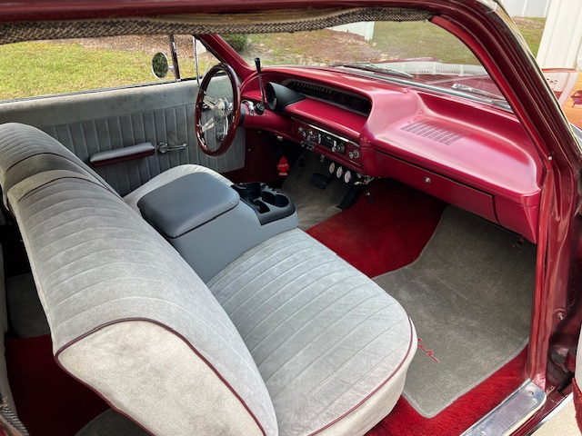 This 1964 Chevy Bel Air is painted in a classy burgundy clear coat. The distinctive wrap around rear window and whitewall tires add to this classy good look. The custom interior accents the exterior beautifully with the gray velour seating with burgundy cording. Added interior features include an AM/FM radio and an aftermarket gauge package including tach, oil, water and volts. Under the hood is a 327ci V-8 attached to a two speed transmission, and power steering. Very sharp car!