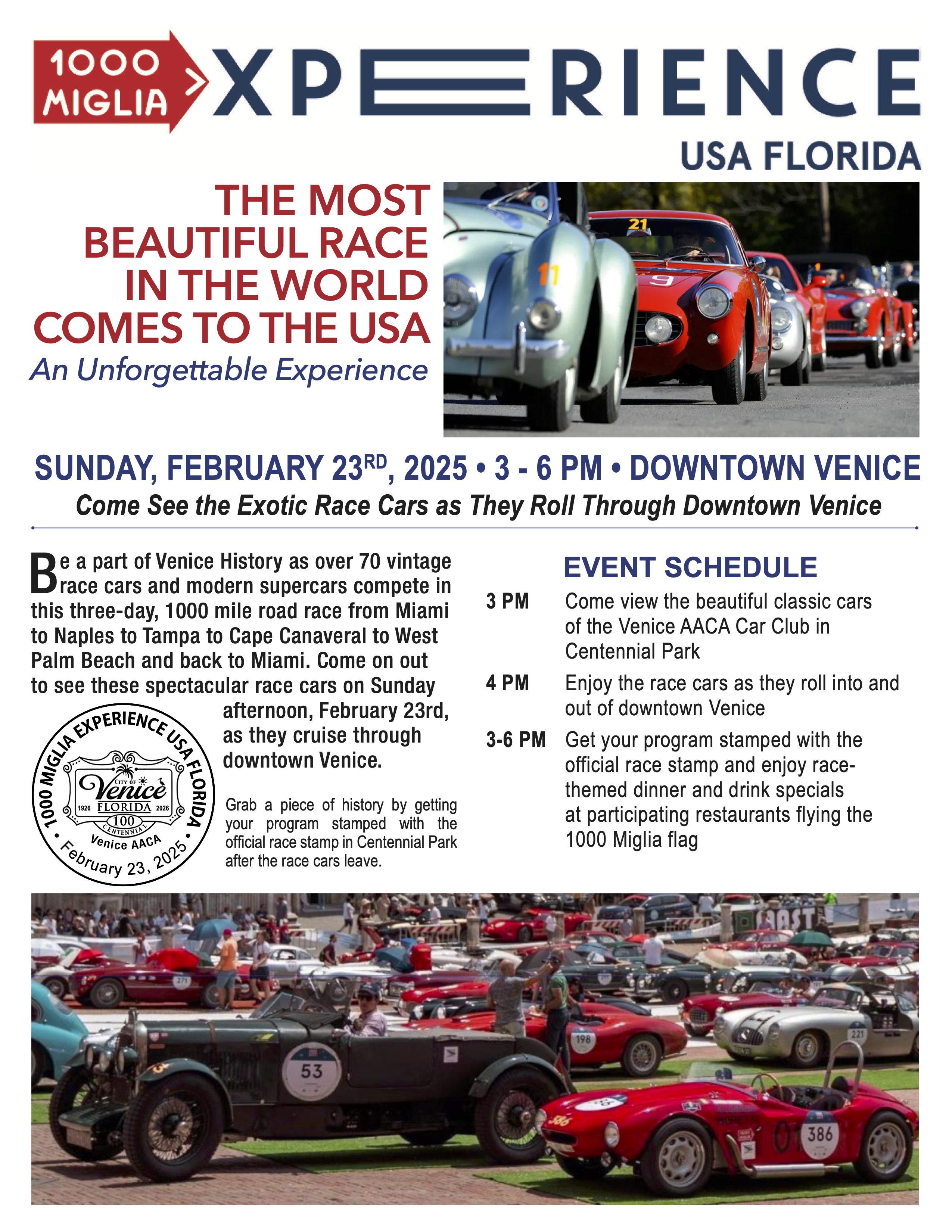 The ICONIC 1000 Miglia road race is coming. Be part of this HISTORIC event. This FREE event is open to the public, and downtown restaurants will be offering race-themed dinner and drink specials. Come on out to see these rare and exotic race cars as they roll through beautiful downtown Venice.