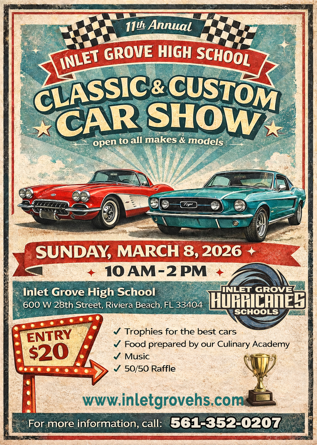 Join us for a day filled with classic and custom cars, delicious food from our Culinary Academy, and a chance to win fantastic prizes in our raffle. Open to all makes, models, and years of cars, trucks & motorcycles. Special awards from Career Academies, Assistant Principles, and Principal's award for Best of Show. Music and 50/50.