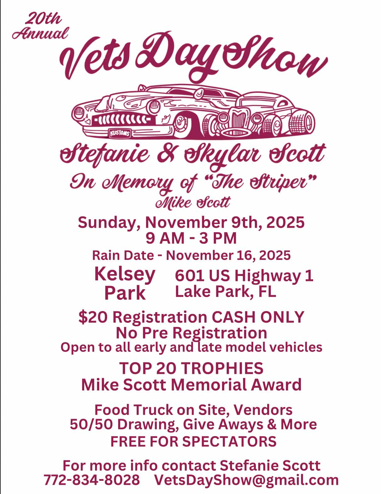 In Memory of Mike “The Striper” Scott. Hosted by Stefanie Scott (widow of “Striper”). Sponsored by the Town of Lake Park. Open to all early and late model vehicles. Top 20 trophies, “Striper” memorial trophies, and a few special awards. Spectators are free. Rain date is November 16.