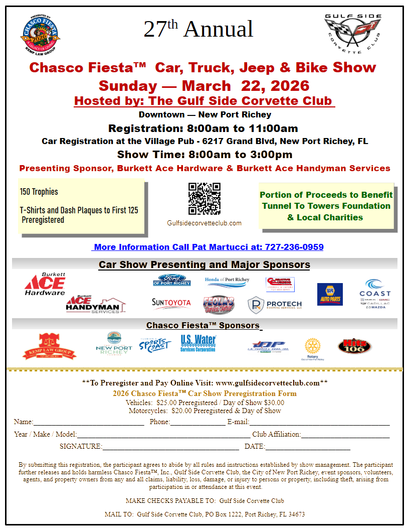 Hosted by the Gulfside Corvette Club. The location is on the streets of historic downtown New Port Richey. Computerized registration and judging will speed up everything. 150 trophies will be presented. Dash plaques and T-shirts will be given to the first 125 who preregister. Online registration HERE.