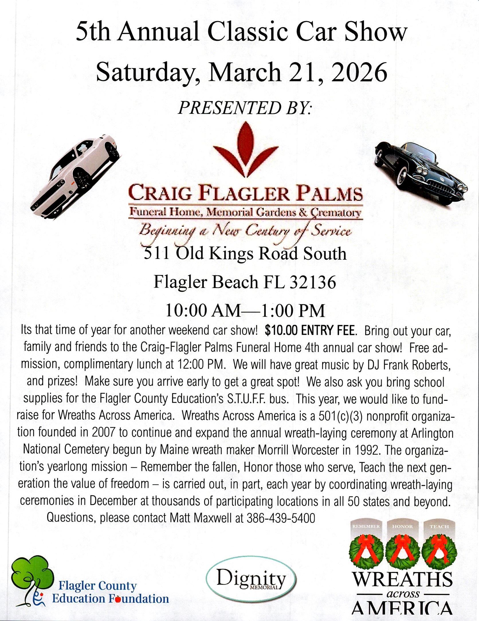 Proceeds will benefit Wreaths Across American. Complimentary lunch at noon. Great music by DJ Frank and door prizes. Please bring a school supply for the Flagler County Education S.T.U.F.F. bus. Spectators are free.
