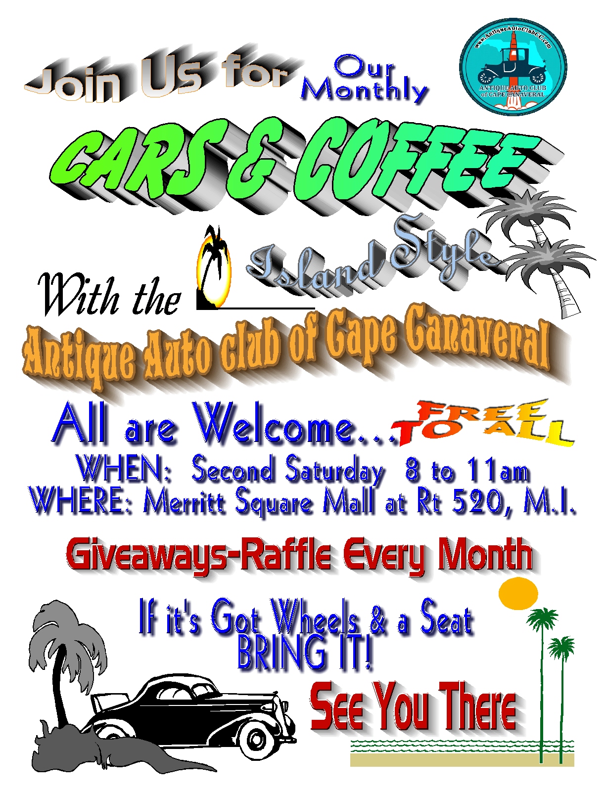 Every month on the second Saturday. Hosted by the Antique Auto Club of Cape Canaveral (AACCC). Located in the Merritt Square Mall. Everyone is welcome. Bring your classic vehicle and enjoy the fun and while you’re there, enjoy a delicious breakfast at First Watch.
