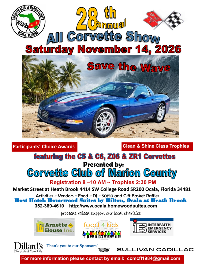 Hosted by The Corvette Club of Marion County. DJ music, food truck, gift basket raffle, and a 50/50 raffle. This is a “Clean and Shine” show with over 60 trophies including 1st, 2nd and 3rd place for all classes entered, Best in Show chosen from each 1st in class winners, 20 Participants Choice trophies, several Sponsor trophies, a Club Participation trophy awarded to the Corvette Club with the most entries, and a “Miles of Smiles” award for the entrant who traveled the farthest distance to attend our show.