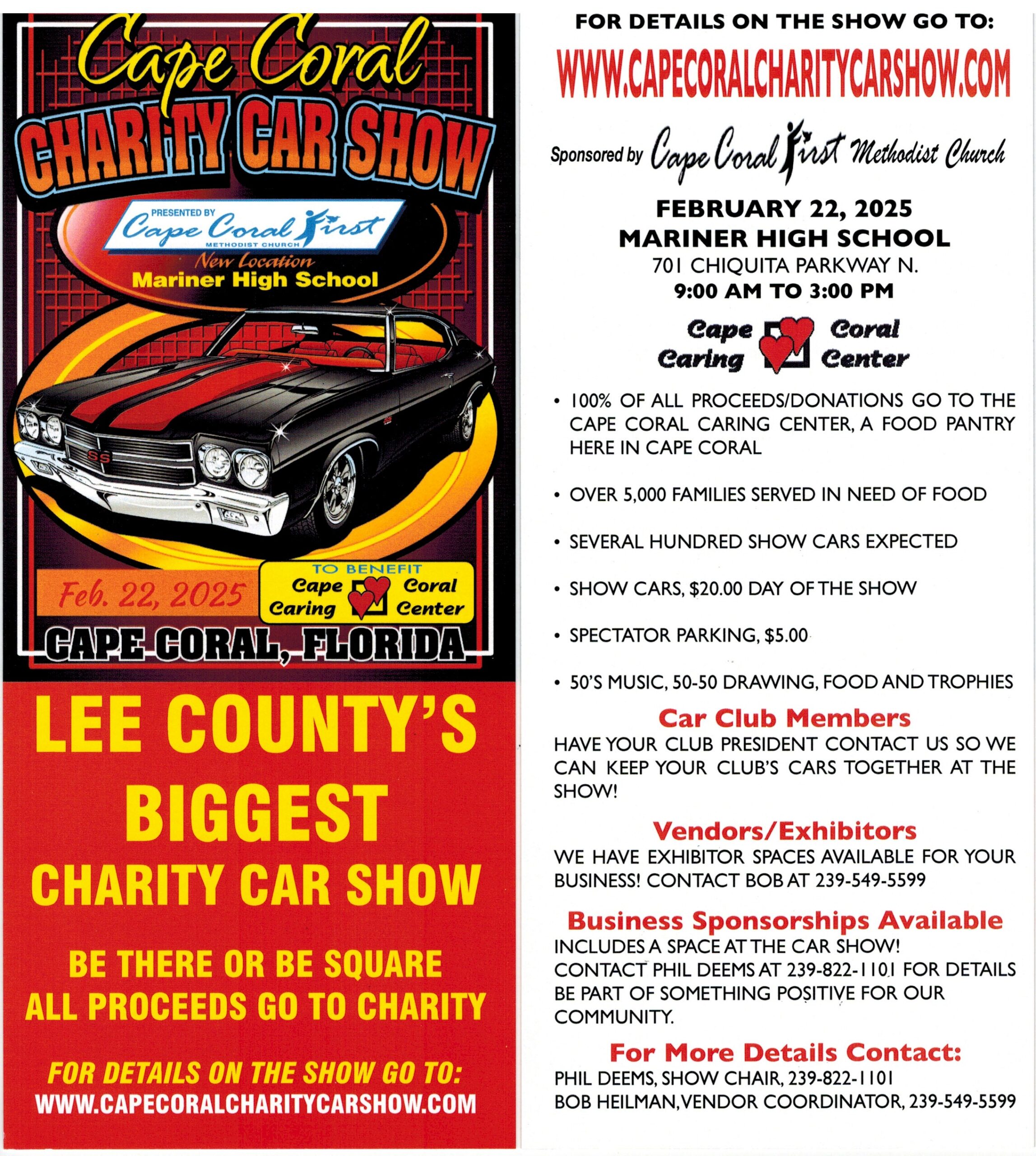 Sponsored by Cape Coral 1st Methodist Church – with proceeds benefiting Cape Coral Caring Center. This event raised $70,000 for the Cape Caring Center in 2024. All years, makes, and models are welcome. Last year we had approximately 400 cars and thousands of spectators.