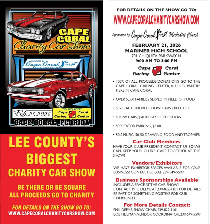 Sponsored by Cape Coral 1st Methodist Church, with proceeds benefiting the Cape Coral Caring Center. This event raised over $110,000.00 for the Cape Caring Center in 2025. This is an open car show with any year car or truck or Jeep invited. Last year we had over 500 cars and thousands of spectators. This car show is for family fun, with a DJ playing 50’s and 60’s music, There will be food, 50/50 drawings, a church bake sale and great door prizes.