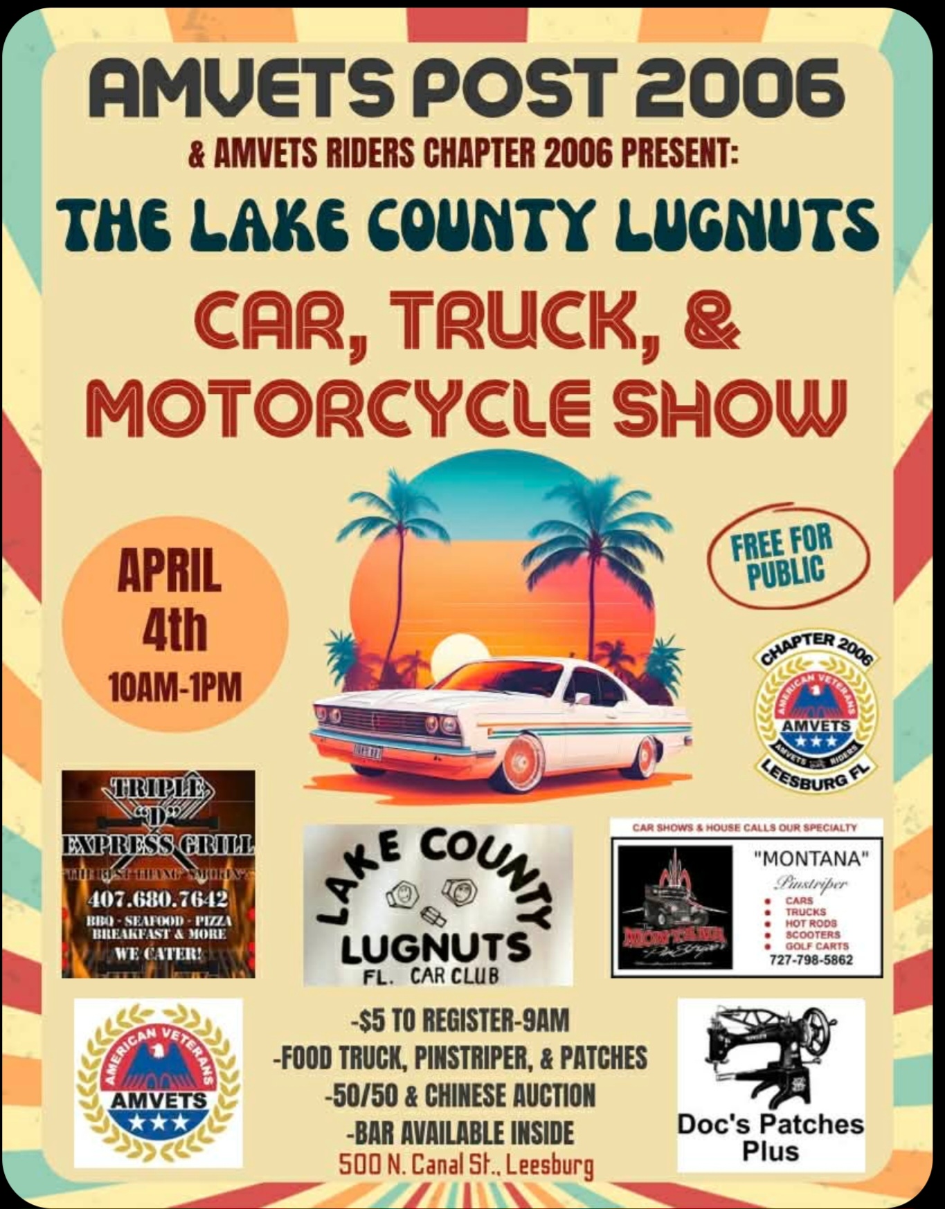 Events Car, Truck & Motorcycle Show Event Details Start: April 4, 2026 10:00 am End: April 4, 2026 1:00 pm Venue: Amvets Post 2006 Address: 500 N. Canal St, Leesburg, Florida 34748 Categories: Central Florida, Saturday Registration Fee: $5 Phone: (480) 243-1427 Email: ronnemac@yahoo.com Hosted by Lake County Lugnuts. Food truck, pinstripper, 50/50,full bar, and Chinese auction. Spectators are free.