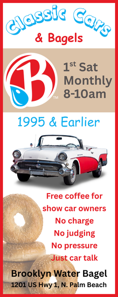 Every month on the first Saturday. Come meet with other classic car/truck owners (1995 and older please) to admire and talk cars. Owners will receive a free hot or cold coffee from Brooklyn Water Bagel Company. No charge for admission, no awards, no pressure. Just enjoy car talk!