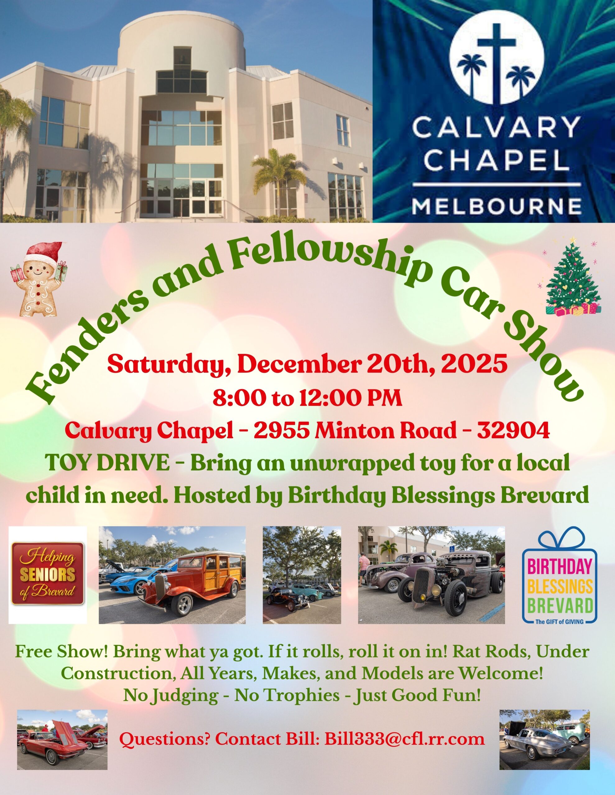 Events Fenders & Fellowship Car Show & Toy Drive Event Details Start: December 20, 2025 8:00 am End: December 20, 2025 12:00 pm Venue: Calvary Chapel Address: 2955 Milton Road, West Melbourne, Florida Categories: East Coast of Florida, Saturday Registration Fee: Free Email: bill333@cfl.rr.com Hosted by Birthday Blessings Brevard. Open to all years, makes, and models. Please bring a new unwrapped toy for a local child in need. No judging, no trophies, just good fun.