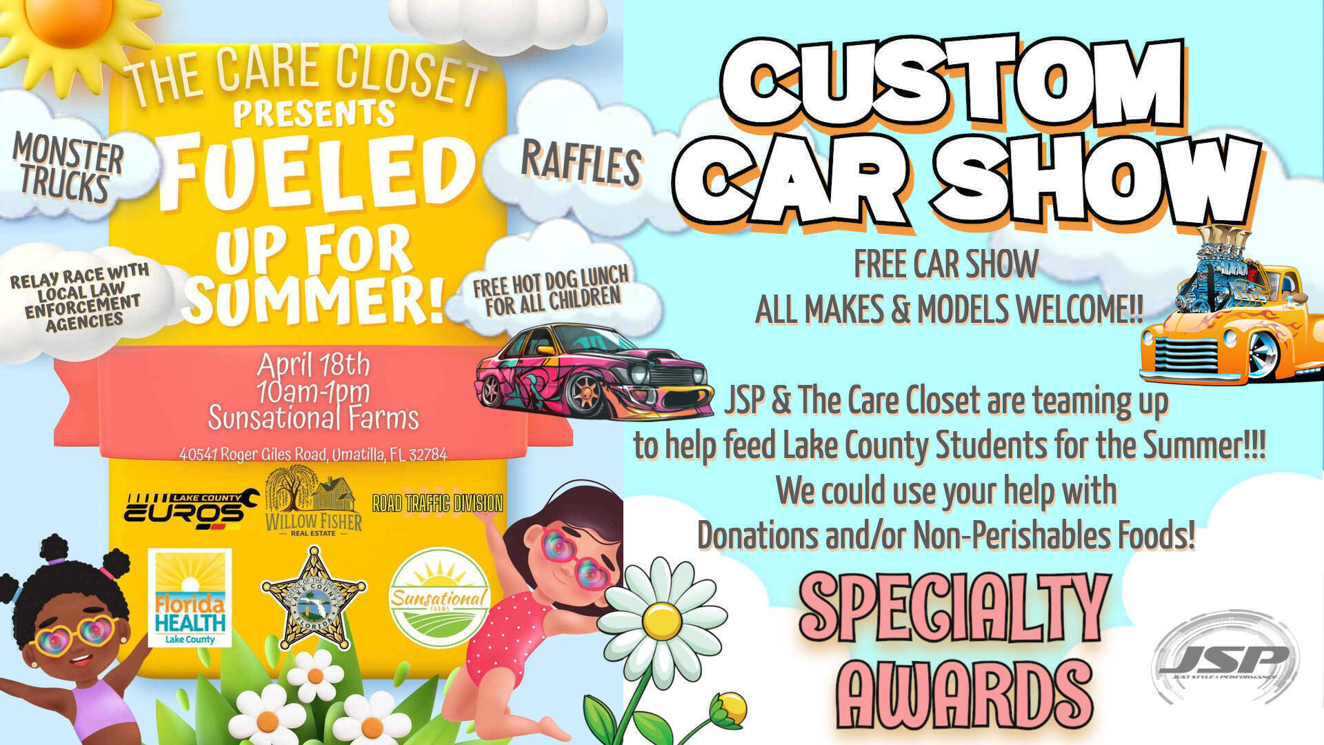 When school lets out at the end of May, a lot of families suddenly lose access to school meals. Fueled Up for Summer is a community get-together hosted by The Care Closet and Just Style & Performance to raise the funds we need to purchase food and help feed local kids and families all summer long. It’s about neighbors helping neighbors, making sure our kids don’t go hungry, and coming together for a really good cause. Specialty awards, raffles, monster trucks, and fun for the whole family. Open to all yeras, makes, and models. Contact us for special monster truck parking.