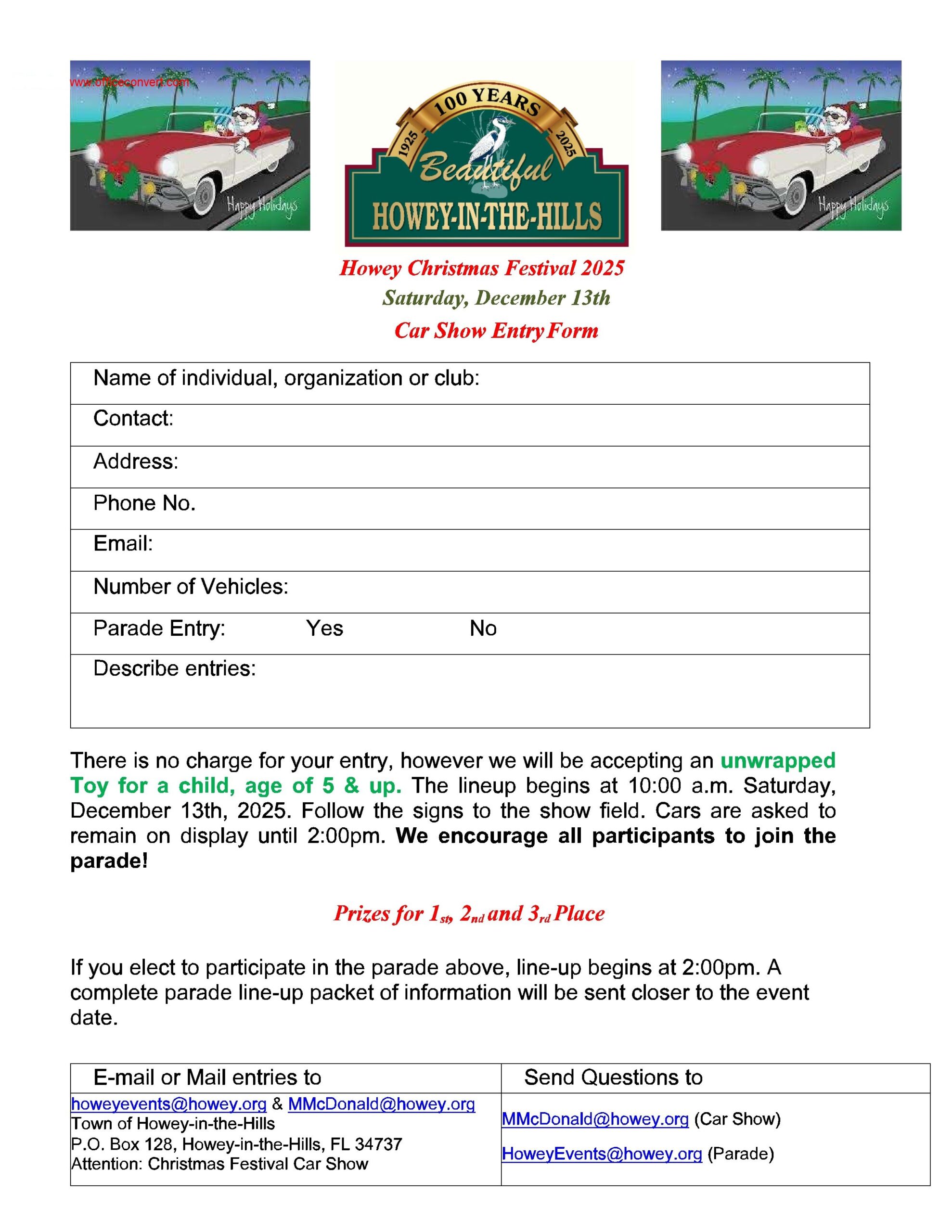 Howey Christmas Festival & Car Show Event Details Start: December 13, 2025 10:00 am End: December 13, 2025 2:00 pm Venue: City Hall Address: 101 N Palm Ave., Howey-in-the-Hills, Florida Categories: Central Florida, Saturday Registration Fee: Free Phone: (352) 324-2290 Email: howeyevents@howey.org Open to all years, makes, and models. Show vehicles are encouraged to stay until 2pm and participate in the parade. The show location would be approximately Hwy 19 (Palm Ave) and E. Central Avenue.
