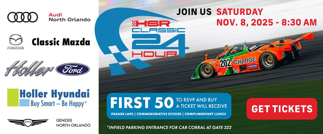 Join 5 of Holler-Classic's dealerships during our annual Car Corral at the HSR Classic 24 Hours. The first 50 people to RSVP per store will additionally get parade laps around Daytona International Speedway and a commemorative decal! All vehicles welcome. Free lunch will be provided. Don't forget to RSVP and purchase your ticket with the link below!