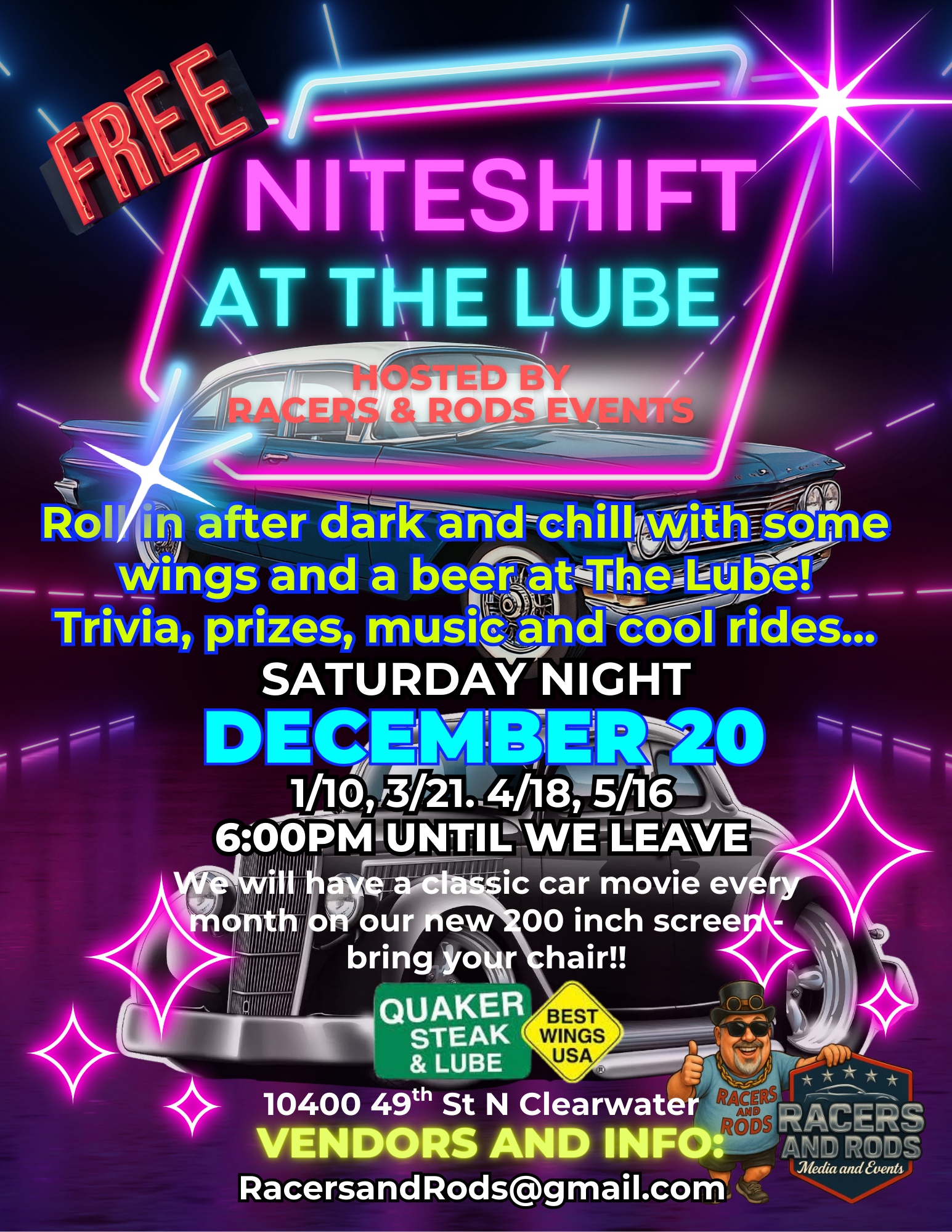 The freaks come out at night…..Join Racers and Rods Events for a relaxed evening of good food and drink, music, trivia, awards and the baddest customs in Tampa Bay. Just cruise in anytime and bring that hotrod to show off. With good attendance this will be come a recurring event throughout 2026 so let's see what you've got. And we have a NEW 200 inch movie screen and will be showing “Talladega Nights, The Ballad of Ricky Bobby” at dusk. Bring your chair, we may even have popcorn.