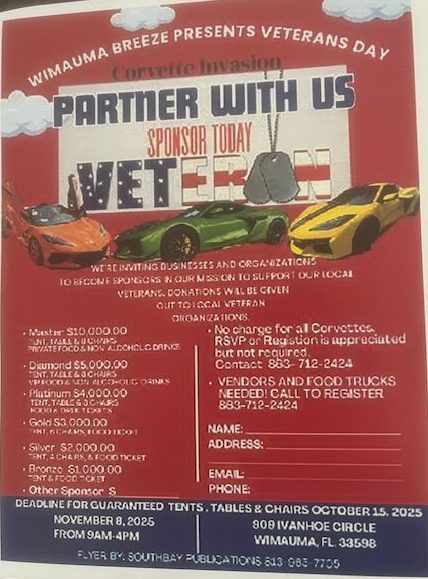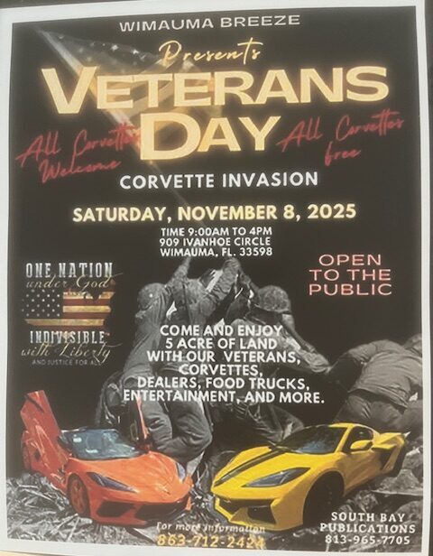 Events Veterans Day Corvette Invasion Event Details Start: November 8, 2025 9:00 am End: November 8, 2025 4:00 pm Venue: Wimauma Breeze Address: 909 Ivanhoe Circle, Wimauma, Florida Categories: Saturday, West Coast of Florida Registration Fee: Free Phone: (863) 712-2424 Come and enjoy 5 acres of country living with our Veterans. Food trucks, entertainment, and lots of vendors.