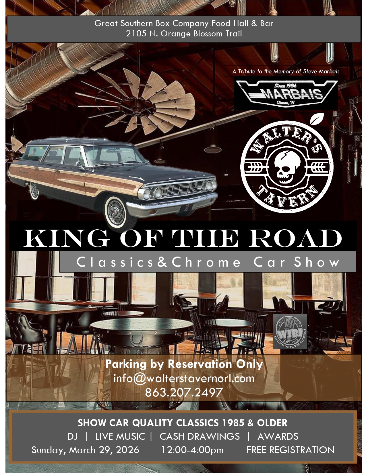 Events Walter’s Tavern – King of the Road Classics & Chrome Event Details Start: March 29, 2026 12:00 pm End: March 29, 2026 4:00 pm Venue: Great Southern Box Company Address: 2105 N Orange Blossom Traill, Orlando, Florida 32804 Categories: Central Florida, Sunday Registration Fee: Free Phone: (863) 207-2497 Email: info@walterstavernorl.com Face Page: https://www.facebook.com/wjbjcruisin/ Free registration for all vehicles of show quality 1985 and older. Parking by reservation only. Please email info@walterstavernorl.com to reserve your space. DJ music, live music, cash drawings, and awards.