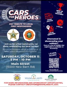 Hosted by the The Miami Lakes Public Safety Committee proudly presents Cars for Heroes – a car show dedicated to our local first responders. Join us for an unforgettable evening in the heart of Miami Lakes as we honor the brave men and women who keep our community safe. Trophies, DJ music, food trucks, local vendors and Main Street merchants. Spectators are free.